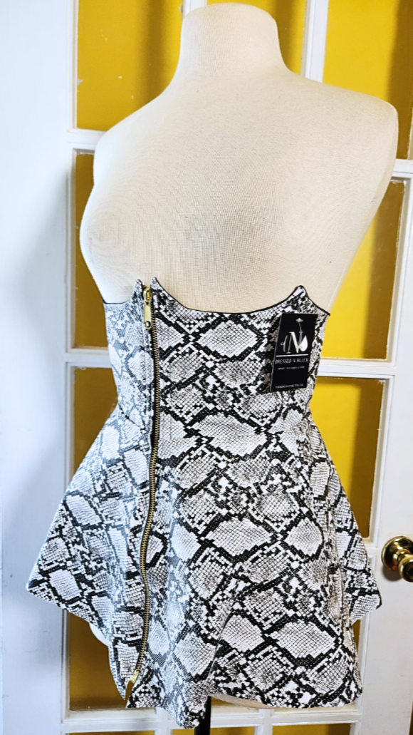 The "Tia" skirt features a bold snake print design that commands attention. Its daring under-bust cut accentuates your silhouette, while the middle zipper ensures easy wear and a sleek finish. Perfect for those who want to make a fearless fashion statement.